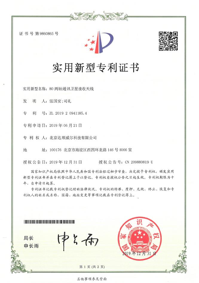 实用新型专利证书9860865:80两轴通讯卫星接收天线